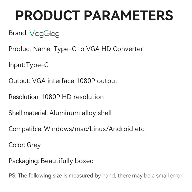 Easily connect your USB-C devices to older VGA-equipped displays with the VegGieg Type-C to VGA Adapter, designed to support smooth Full HD output at 1080P @ 60Hz. Whether you're presenting at the office or watching videos on a projector, this adapter ensures reliable performance and crystal-clear visuals.