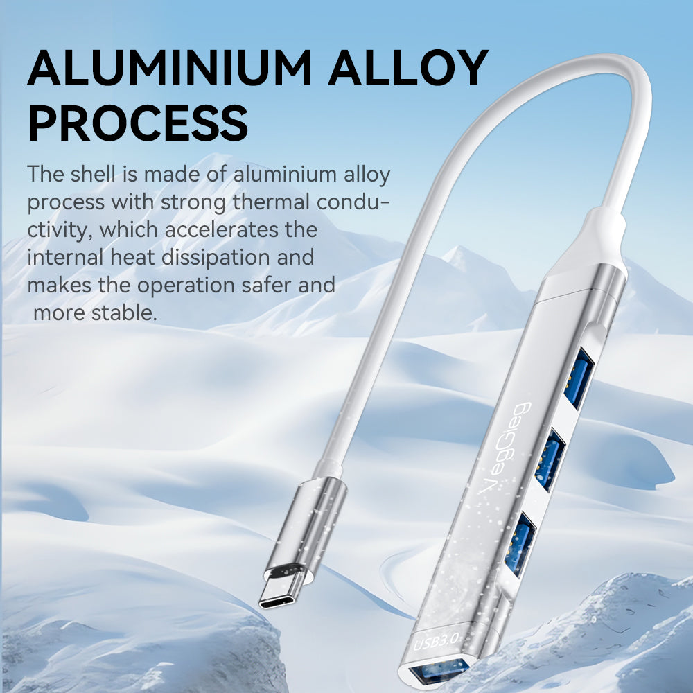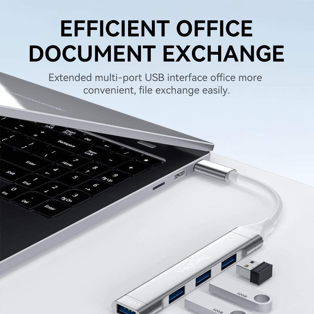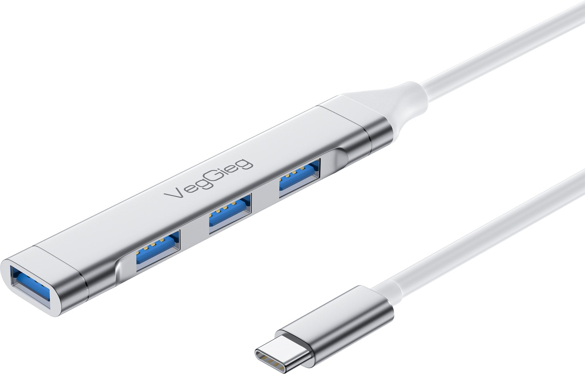 VegGieg USB-C to 4-Port USB Hub | 1× USB 3.0 + 3× USB 2.0 | Silver Alloy Shell | 0.15m Braided Cable | Compact & Durable